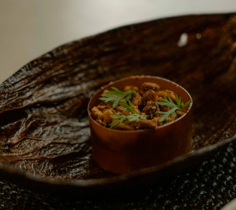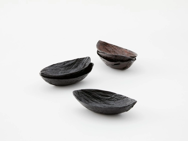 한지의 주원료인 닥나무 섬유(닥줄기)로 형태를 만들고 옻칠하여 자연에서 온 나뭇잎 형태를 가진 디저트 보울입니다, 시각적으로 은은하고도 고급스러운 옻칠과 함께 닥줄기의 자연스러운 재질감을 느낄 수 있으며 촉각적으로도 새로운 감각 경험을 제안합니다.
